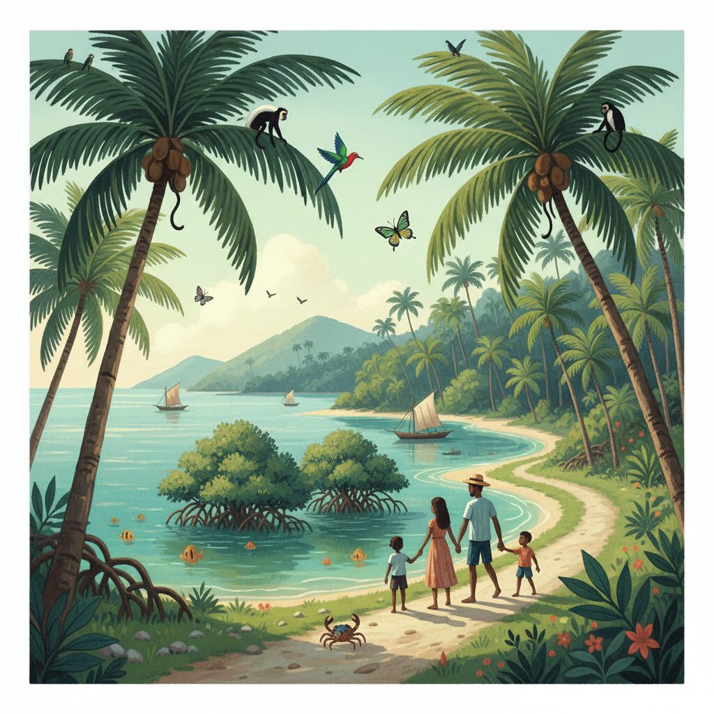 島の海岸線の多くは、複雑に入り組んだ水路と広大なマングローブの森で覆われています。このマングローブ林は、多くの海洋生物の産卵場や稚魚の成育場所「生命のゆりかご」であると同時に、高波や浸食から島の生活を守る天然の防波堤としての役割も果たしています。