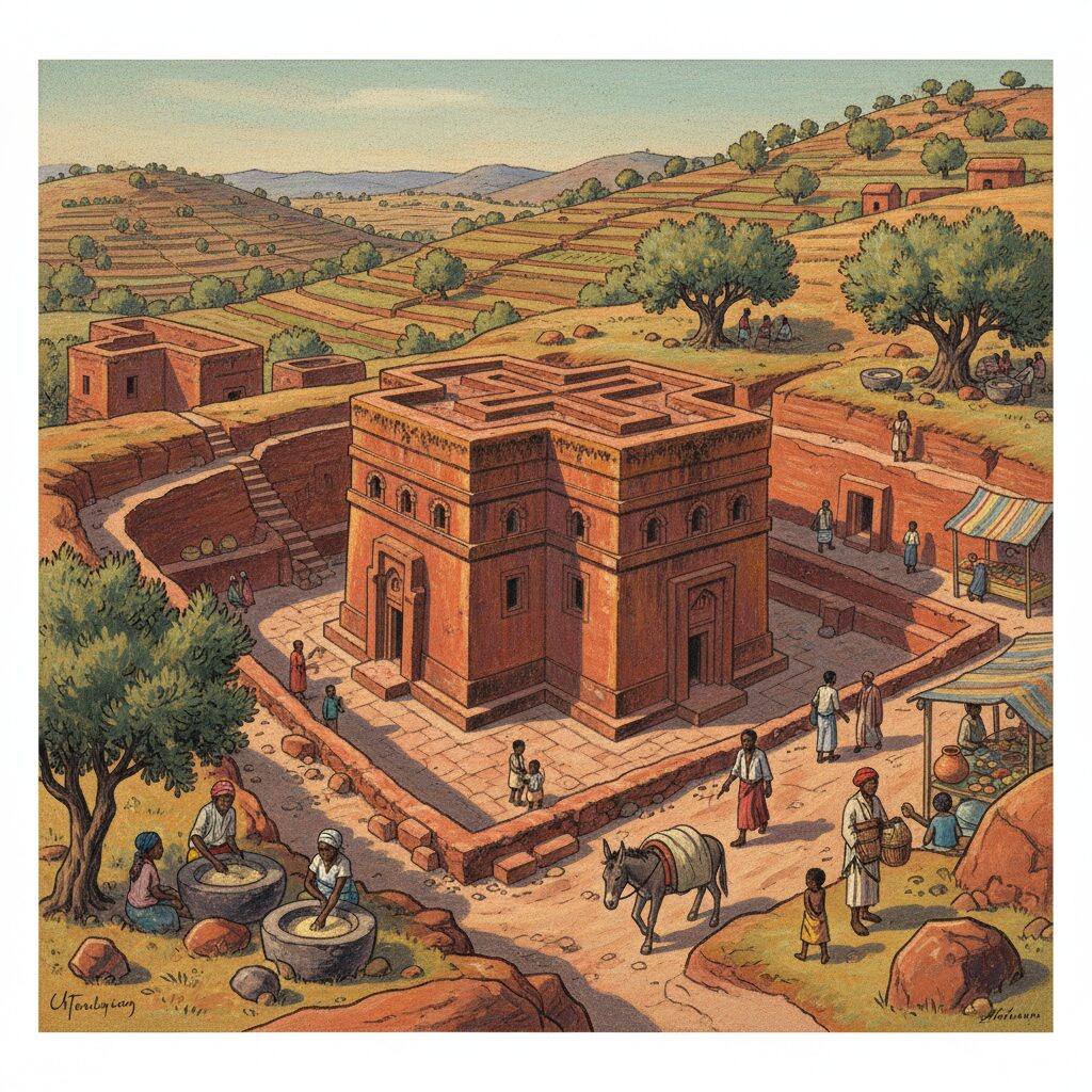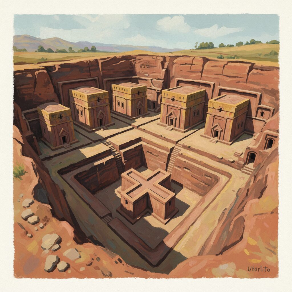 ここは、巨大な一枚岩を、まるで彫刻を彫るかのように地上から掘り下げて造られた、11もの岩窟教会群が点在する場所。空から見下ろさなければ、そこに教会があることすら分からないかもしれません。「神の御業」、あるいは「天使が一夜にして造り上げた」という伝説が、あまりにも自然に信じられてしまうほどの、圧倒的な光景が広がっています。