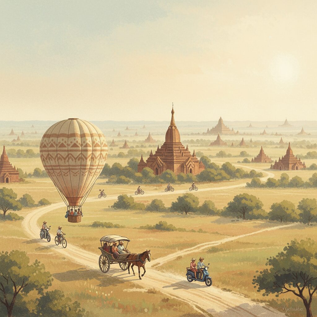 東京の山手線の内側とほぼ同じ広さに点在する仏塔群があるバガン。この広大な地域を効率的かつ楽しく回るためには、移動手段の選択がとても重要です。それぞれの特徴を把握し、自分のスタイルに合った方法を見つけましょう。