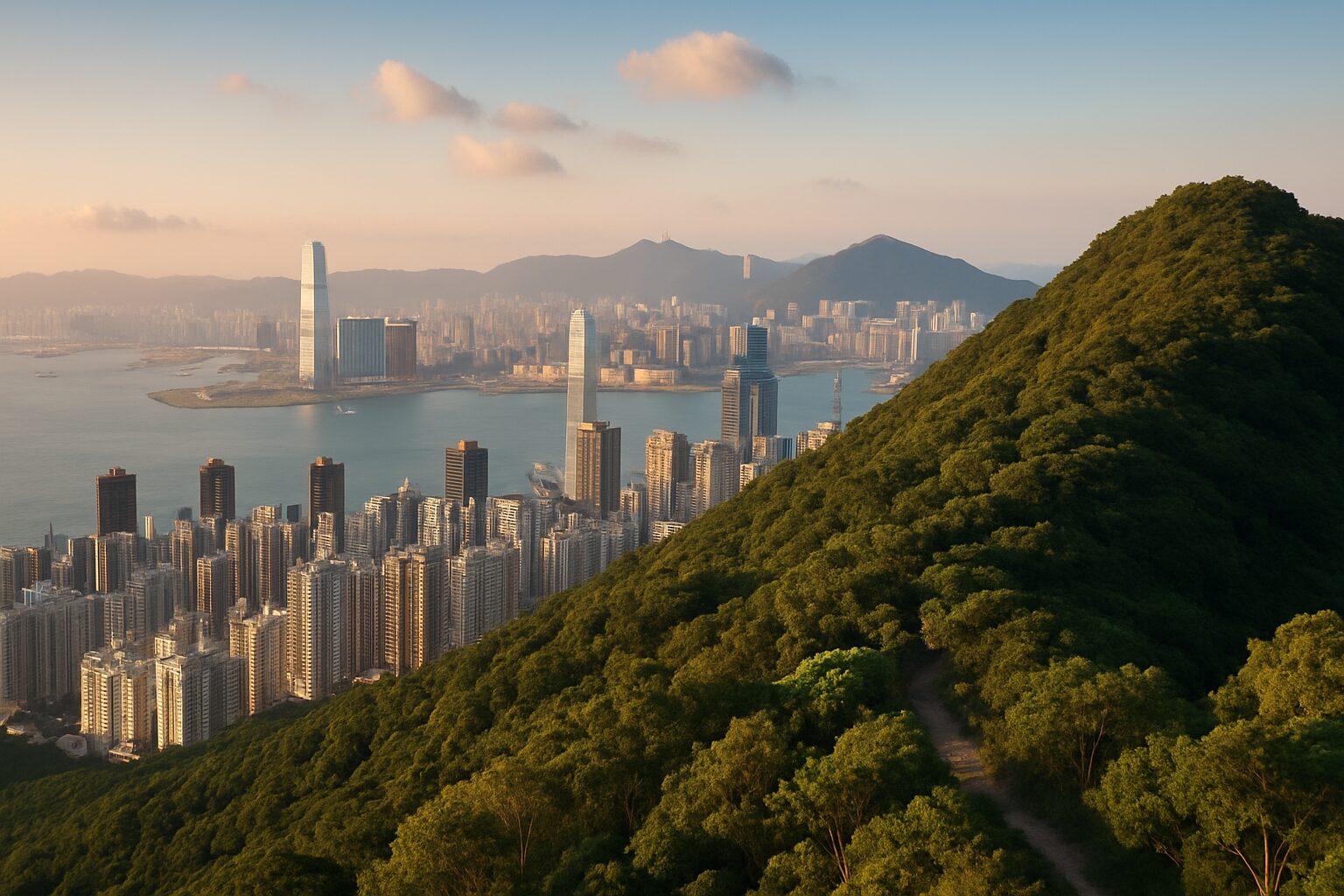 一方、東側に目を向ければ、私たちにお馴染みの「香港」の街並みが広がります。ヴィクトリア・ハーバーのきらめく水面、対岸にそびえる九龍半島のビル群、そして足元に広がる香港島の高層ビル群。歴史的な要塞跡から現代の繁栄をひと望にできるこの場所は、香港の過去と現在が交わる特別なポイントと言えるでしょう。