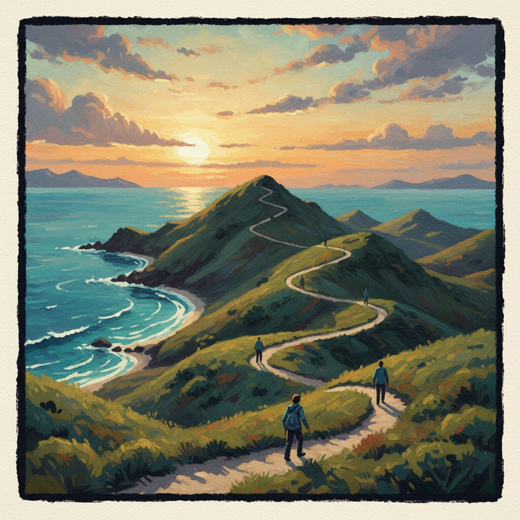 途中にはいくつかのビューポイントがあり、息を整えつつ徐々に高度を上げていけます。焦らず、それぞれの場所で立ち止まり、視点を変えながら景色を堪能しましょう。下から見上げる丘の連なり、中腹から見下ろす湾の形、どれもが写真映えする絶景です。