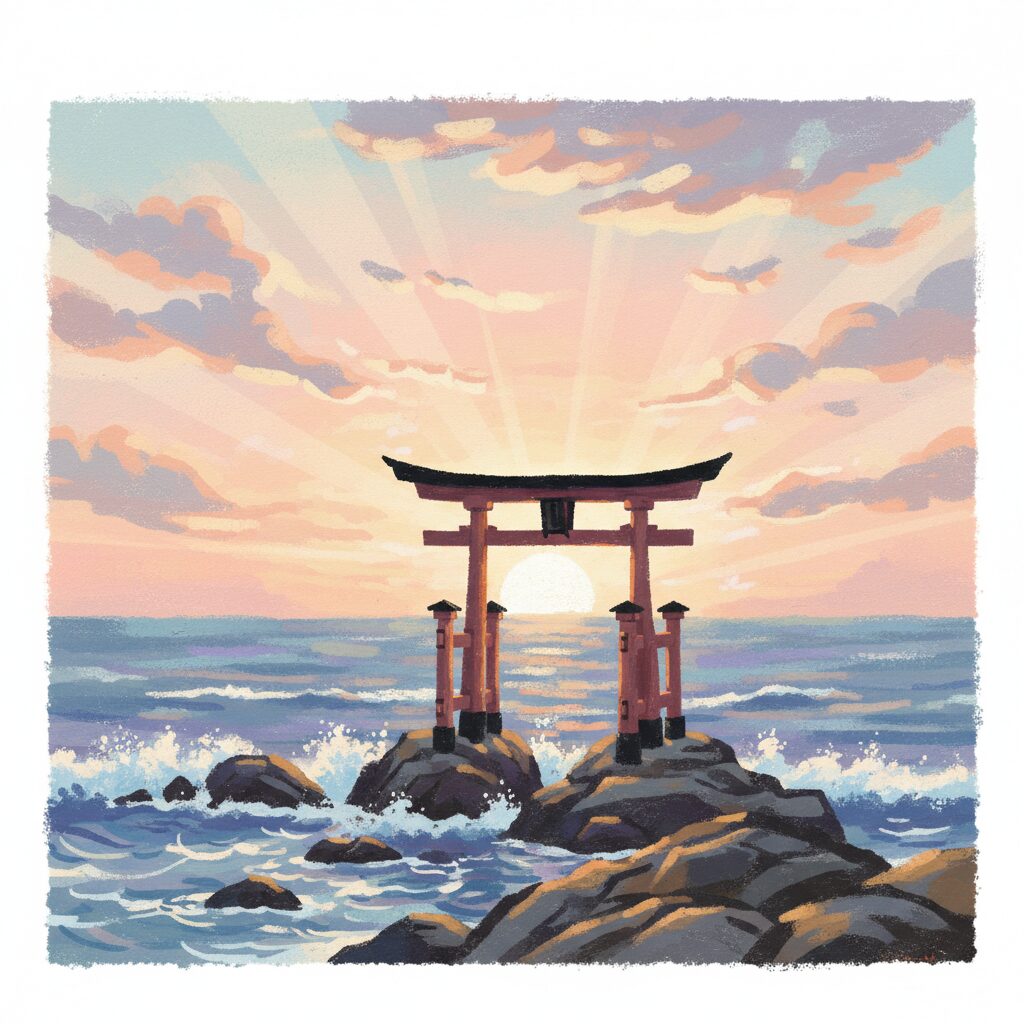 神磯の鳥居 – 夜明けの海に浮かぶ神聖な絶景