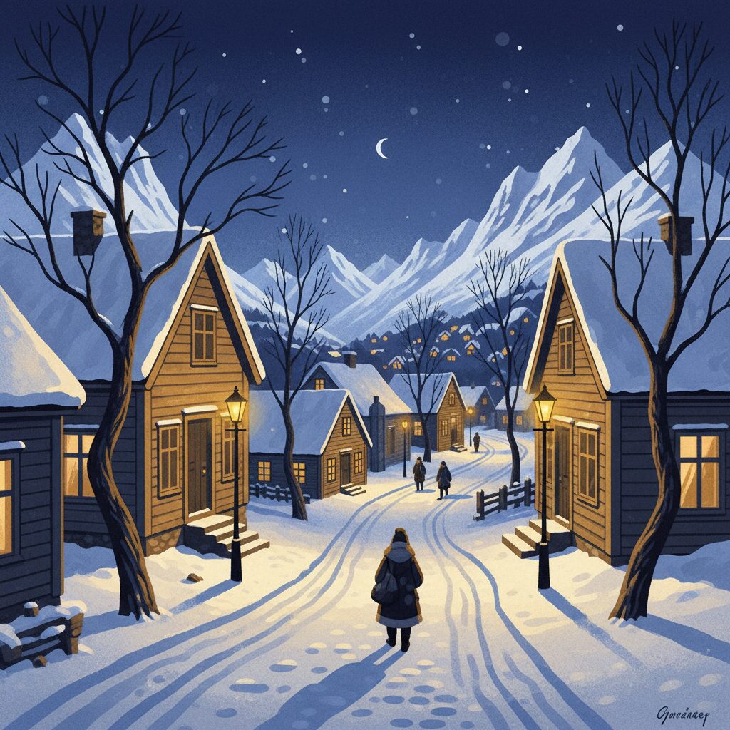 私たちの多くが「北欧」と聞いて真っ先に思い浮かべるのは、長く明るい夏や白夜に包まれた幻想的な光景かもしれません。しかし、私が求めていたのはそのまったく逆の世界でした。太陽が地平線の下に長く沈み、一日中淡い明かりと闇が支配する「極夜(ポーラーナイト)」の季節です。スヴォルヴァールのこの時期は、まるで世界から色彩が消えたかのようなモノクロームの静寂に包まれています。しかし、その闇は決して単調で退屈なものではありません。空は次第に表情を変え、濃い藍色から淡い紫色、そして深い漆黒へと移ろいゆきます。街の灯りが雪に反射して、まるで宝石のように輝きを放つのです。
