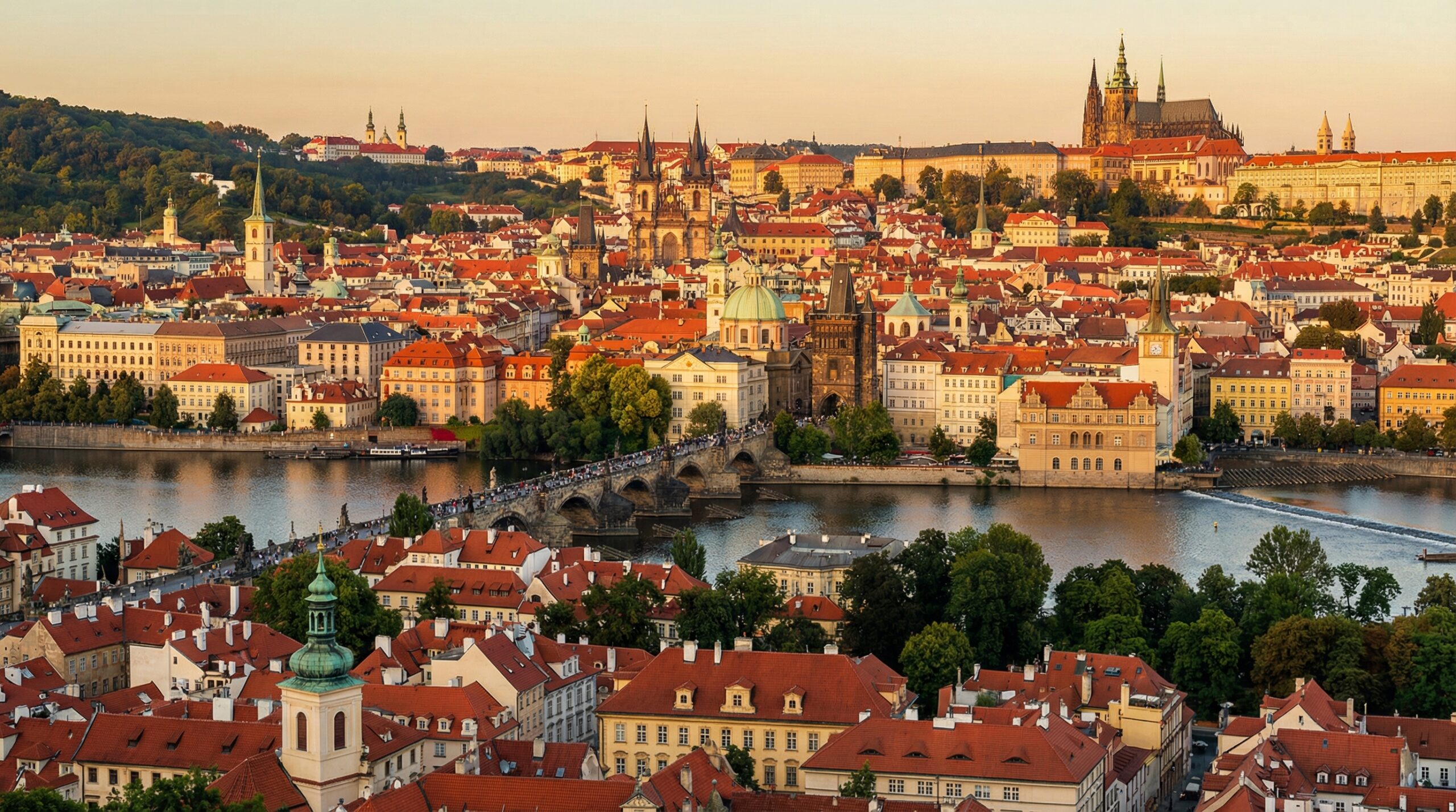 眼下に広がるのは、オレンジから赤へと美しいグラデーションを描く屋根の波。そこを縫うようにヴルタヴァ川がゆったり流れ、カレル橋をはじめとした複数の橋が架かっています。そして街のあちこちから天高く伸びる緑青色の尖塔たち。「百塔の街」と称されるプラハの名が決して誇張でないことを実感させられます。