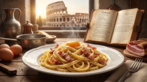 ここで、あえてトマトを使わないローマを代表するパスタ「カルボナーラ」も紹介しておきましょう。グアンチャーレ、卵、ペコリーノ・ロマーノ、黒こしょうだけで作られる、濃厚でクリーミーな一品です。日本で一般的な生クリームは用いません。カルボナーラの起源は意外と新しく、第二次世界大戦後にアメリカ軍がもたらしたベーコンと卵からヒントを得て誕生したという説が有力です。トマトを使ったパスタが19世紀のイタリア統一とともに広まったのに対し、カルボナーラは20世紀の歴史的背景の産物。これら二つのパスタの歴史に触れることで、ローマの食文化が時代の変遷とともに歩んできた様子が垣間見えます。
