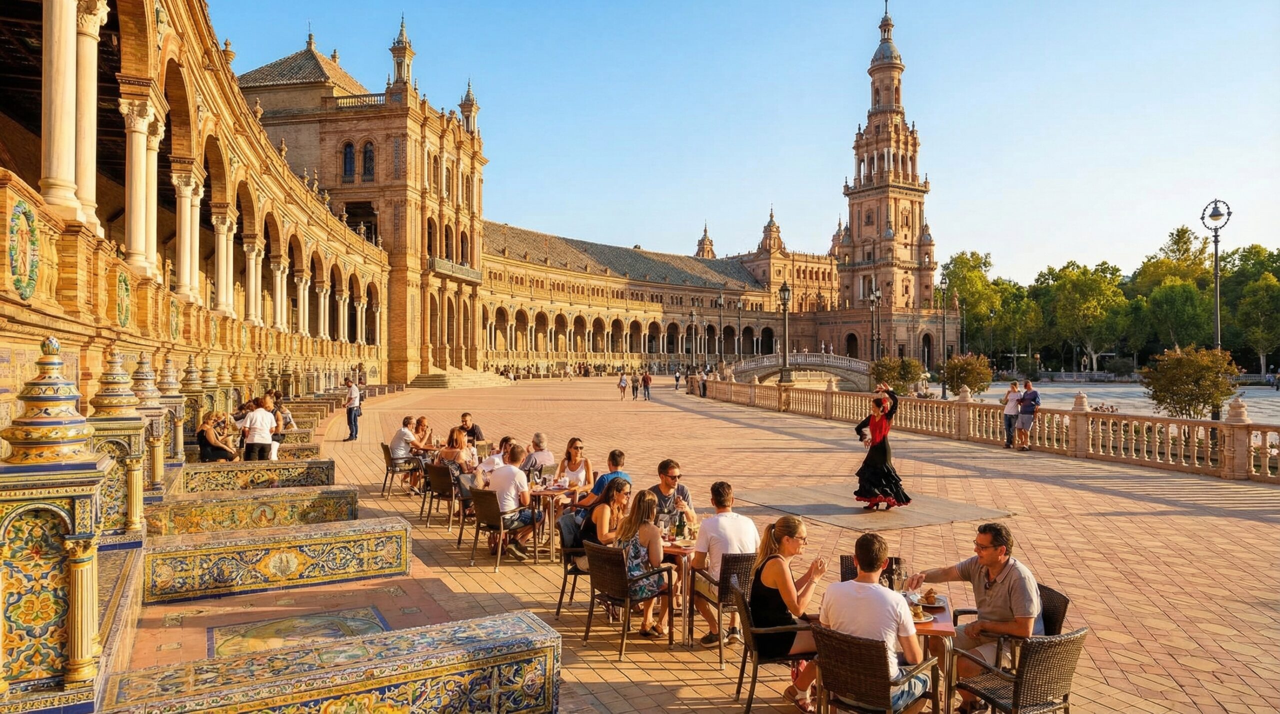 - セビージャの春祭り(フェリア・デ・アブリル):4月に行われ、移動遊園地や「カセータ」と呼ばれるテントが並び、人々は伝統衣装に身を包んで夜通し踊り続けます。