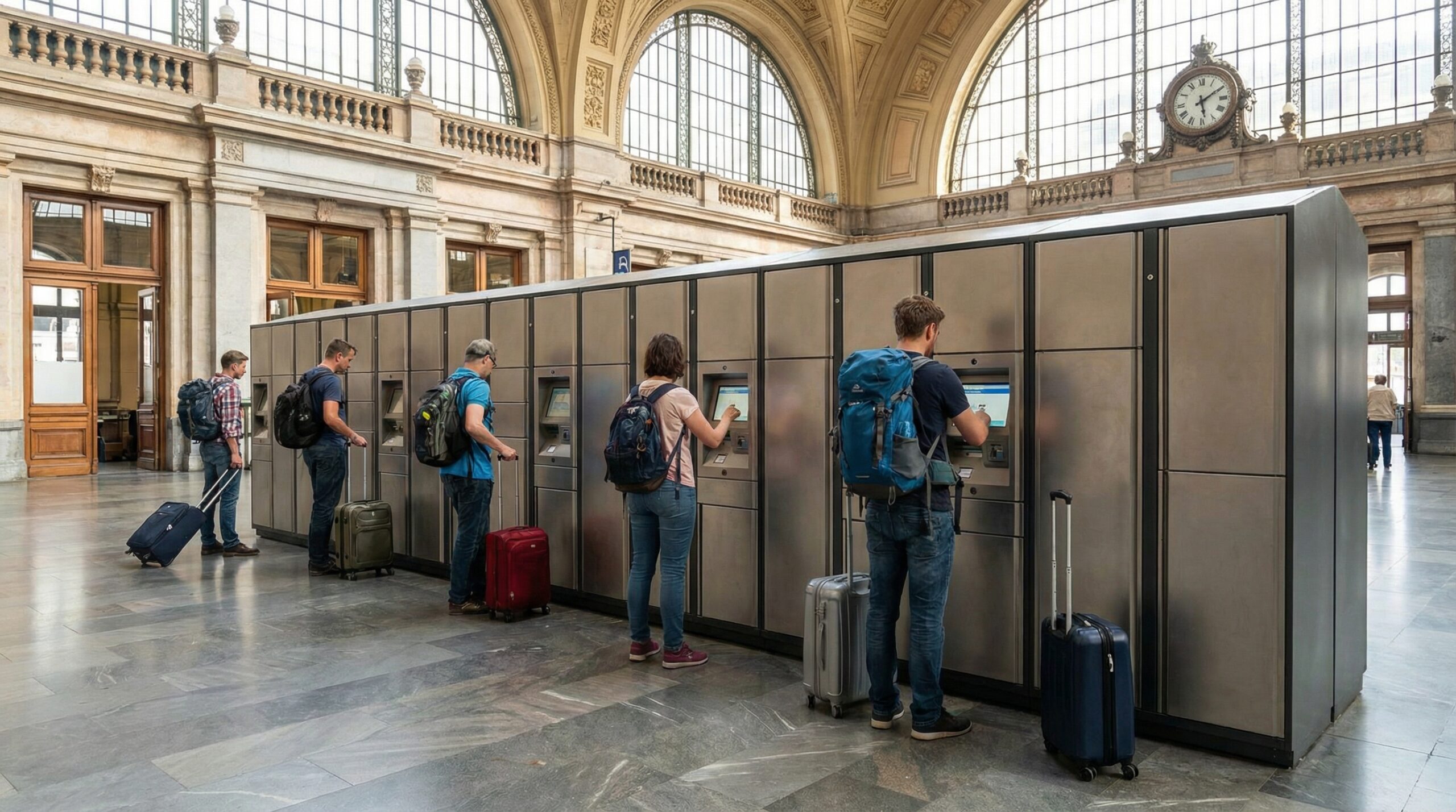 ユーロスターやタリスをはじめとする国際列車が発着するブリュッセル南駅は、ベルギー最大級かつ最も複雑な駅の一つです。ここには有人の荷物預かり所と自動コインロッカーの両方が設けられており、後者は24時間利用可能(ただし駅閉鎖時間は除く)で、小型から特大まで多様なサイズが揃っています。特大ロッカーなら長期旅行用の大型スーツケースも楽に収まります。